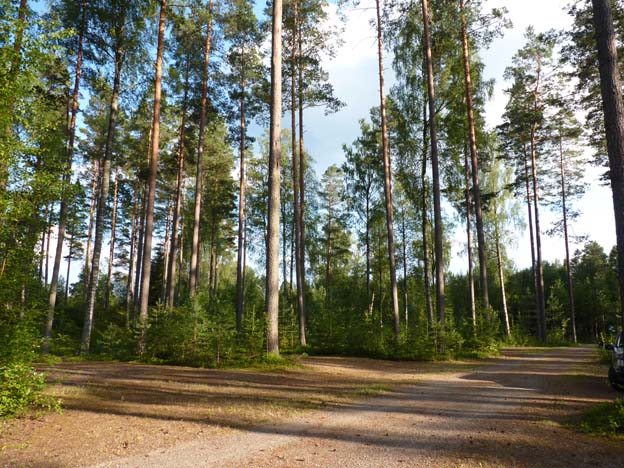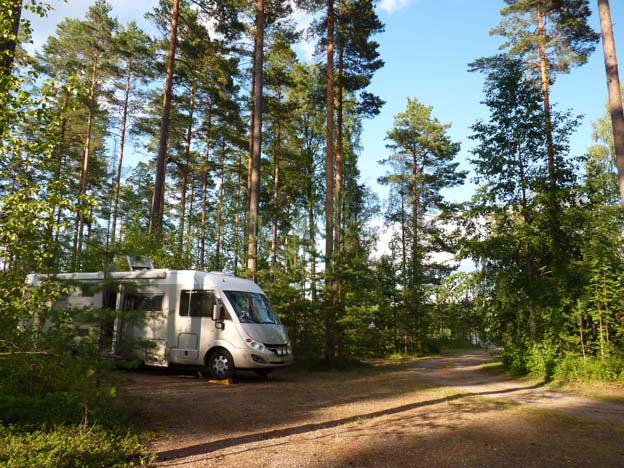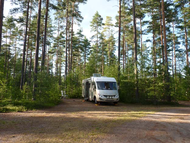 De flesta platserna i skogen är tillräckligt stora för att man ska få plats med en stor bil. Några lutar i mesta laget, men med hjälp av klossar under hjulen fungerar det bra.