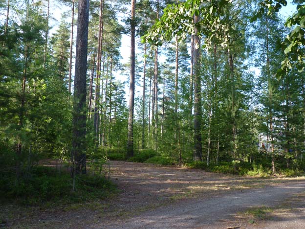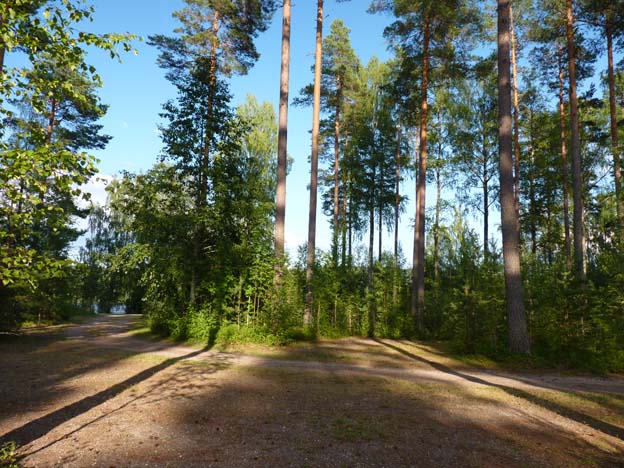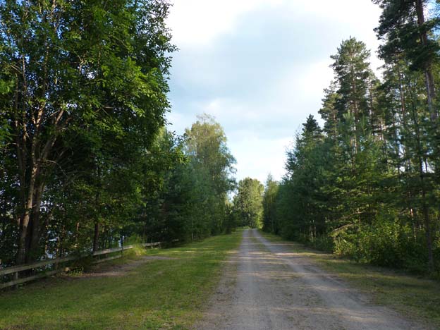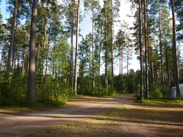 Grusvägen som förbinder de olika sektionerna med varandra. Det finns ett servicehus vid varje gräsplan, men inget i skogen. Campingen är så liten så det är inte långt att gå oavsett vart man parkerar.