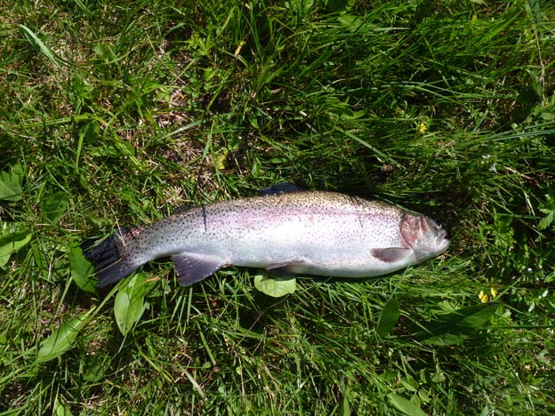 Vi kastade i våra spön och det tog inte lång tid innan jag fick en regnbåge. Lelle fick också napp inte långt efter. Vi tog upp tre fiskar som vägde drygt ett kilo styck.