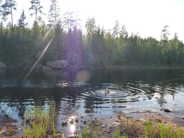 Det var så varmt så vi passade på att bada lite, samtidigt som vi fiskade. Det finns folk som säger att man skrämmer bort fisken då, men det håller jag inte med om, inte när det gäller odlad fisk i alla fall. Den brukar ofta nappa bättre efter att man har badat. Det finns två teorier om varför. Den ena är att fisken inte vill vara kvar i vattnet när den får syn på mig, den andra, som kanske stämmer bättre, är att när man badar rör man upp en massa skit från botten, som fisken sedan blir nyfiken på och vill utforska. Jag vet inte vad som stämmer, men vi brukar i alla fall få fisk fastän vi badar runt fiskelinorna.