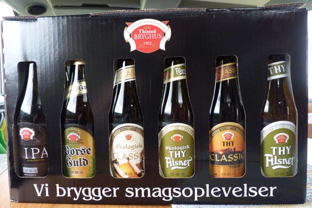Som tur var hade vi köpt ett tolvpack öl i affären när vi checkade in på campingen, så vi hade något att sysselsätta oss med. Det var 8 olika sorters öl från det lokala bryggeriet. IPA:n och en av de andra, en ale som inte syns på bilden, tyckte jag inte om, men de andra var helt ok. 139 danska kronor för 12 starköl, gör att man kan rida ut vilken storm som helst.