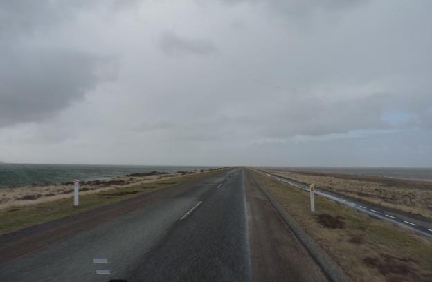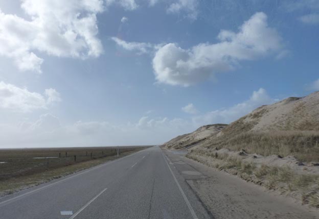 När vi hade passerat Agger såg kustvägen ut som jag hade tänkt mig när jag såg den på kartan. En lång raksträcka och vatten på båda sidor om vägen.