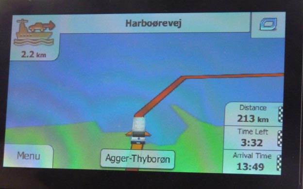 Vi checkade ut från campingen efter en blåsig natt. Vi hade tänkt åka kustvägen, väg 181, söderut genom Danmark. En del av vägen skulle det vara färja, vi fick telefonnumret till färjan av kvinnan i receptionen, eftersom det var osäkert om den skulle gå på grund av blåsten. Vi struntade i att ringa, vi ville ju åka den vägen. Om inte färjan skulle gå, skulle det bli ett par mil att åka tillbaka, men vi chansade.