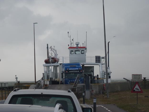 I väntan på färjan. Det blåste ordentligt, men färjan körde i alla fall. Vägen tar slut efter Agger, man måste färja över till Thyborøn. Det är en mycket liten färja som kör, men det är inte långt över till andra sidan, där väg 181 fortsätter. Det tar ca 10 minuter att åka över. För oss kostade det 200 Dkr, varav 160 Dkr var för bil över 6 meter.