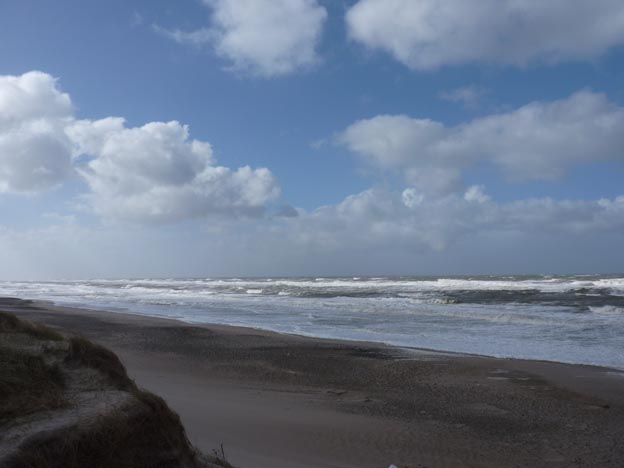 Vi fortsatte kustvägen söderut via Thorsminde, förbi Hvide Sande, där det fanns en camping som såg tråkig ut. Man såg inget vatten från vägen, det var bara höga sandvallar. Vägen var bra åtminstone, men om man vill se havet från bilen får man välja en annan väg.