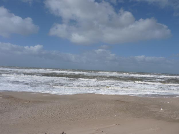 Det fanns många parkeringsplatser längs vägen, där man kunde stanna och klättra över sandvallen. Havet var vackert, men inte badvänligt, även om det hade varit varmt. Det var alldeles för mycket vågor. När vi kom in i bilen efter att jag hade fotograferat var vi fulla av sand överallt. Det rasade sand ur håret och från kläderna. Det var så mycket sand som blåste i luften så att det nästan gjorde ont i kinderna när man fick den på sig. Havet var vackert, i alla fall.