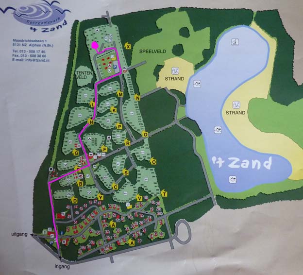Recreatiepark ‘t Zand är en väldigt stor camping. Vår plats ligger under den rosa ringen högst upp på bilden. Följer man det rosa strecket från receptionen till platsen är det ca 1200 meter.