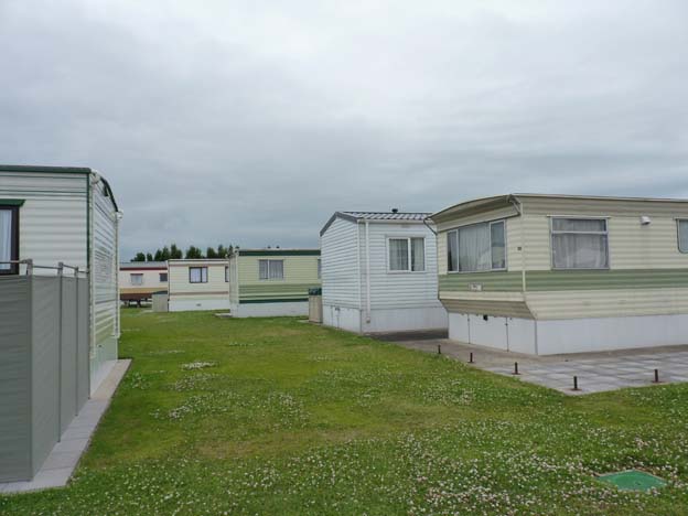 Här ser man in till granncampingen. Husvagnen står där. Det ända som skiljer campingarna åt är ett lågt nätstängsel. I byn Bredene finns en mindre, enkelriktad gata som går parallellt med huvudleden. Åker man in på den passerar man 8 – 10 campingar på en sträcka som är drygt en kilometer lång. Campingarna ser ungefär likadana ut, så det verkar som att det bara är att parkera längs vägen och gå runt och fråga efter plats.