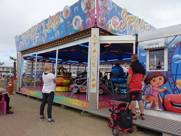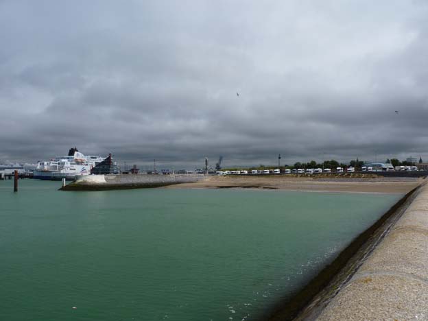 Ställplatsen ligger med hamnen på ena sidan, och turistgatan och stranden på andra sidan. De vita klumparna som syns längst in på bilden är husbilar. Den lilla stranden som syns här var avspärrad. Det satt stora skyltar där det stod ”tillträde förbjudet”. Vi träffade några engelsmän, skottar och irländare som alla berättade samma sak: den här strandremsan låg för nära båtarna som gick till Dover. Badstranden, som låg nästan precis bredvid, låg ändå så pass långt bort så att båtarna hade hunnit för långt ut för att det skulle gå att simma till dem.