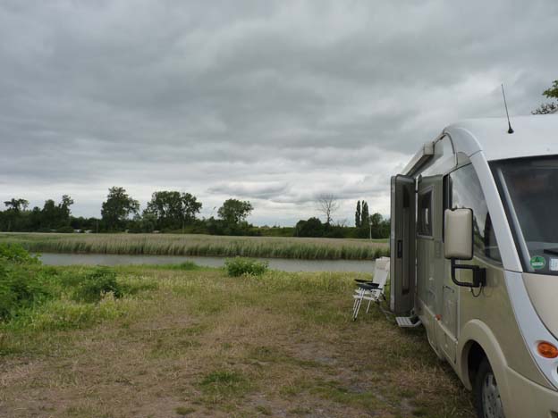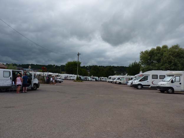 Platsen var extremt stor, enligt BordAtlas har den 140 platser. Den var uppdelad i flera olika områden. Kl 22 på kvällen räknade vi alla bilar, då var det ca 170 stycken. Det fanns fyra lediga platser kvar, varav en i en stor vattenpöl. På dagen var det en väldig rörelse på ställplatsen. Många verkade parkera en liten stund för att se på byn, och sedan åka vidare.