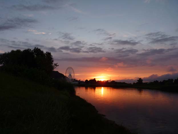 På kvällen blev det en vacker solnedgång över ett lysande pariserhjul och en rosafärgad flod.