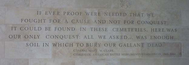 Vad jag förstår så ligger kyrkogården på amerikansk mark. Det finns, förutom själva kyrkogården, en stor utställningshall med information om kriget och landstigningen på Dagen D. Man behöver inte gå in i utställningshallen, men jag rekommenderar att man gör det. Det fanns informationstavlor på flera språk, det fanns bilder och flera korta filmer att se på.