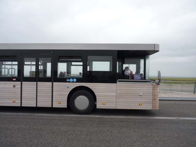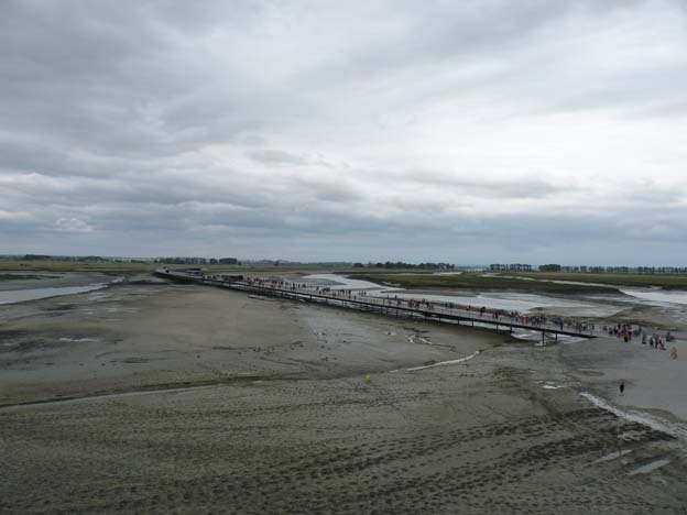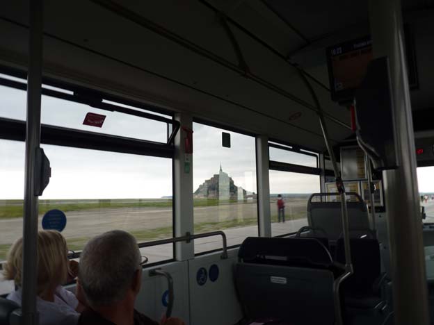 Framme vid klostret fanns det busshållplatser. Privat fordonstrafik över bron var förbjuden. När vi var där fanns det inget vatten, tidvattnet hade dragit bort vattnet till klostrets baksida.