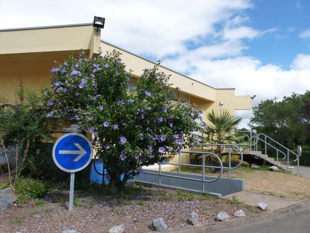 Servicehuset låg i en rondell mitt på campingen. Det var rent, fräscht och dekorerat med blommor och buskar utanför.