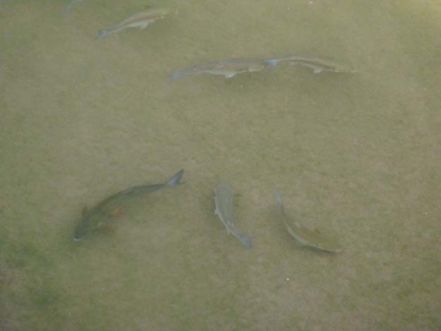 Från bron såg vi massor av fiskar i floden. Jag vet inte riktigt vad det är för sort, men de var stora och såg goda ut.