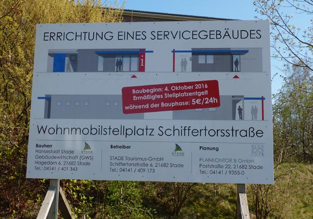 När vi kom till ställplatsen var det första vi såg den här stora skylten. Det var söndag, så det var ingen som arbetade på bygget, som tur var. Det kommer alltså att finnas ett fint servicehus på platsen inom kort.