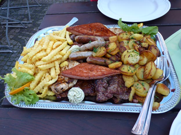 I den ingick pommes frites och stekt potatis, varsin leverkorv (det är den som ser ut som en falukorvsskiva), varsin fläskkarré, varsin biff, varsin kycklingfilé, 10 korvar i prinskorvstorlek, kryddsmör, sallad på tallriken och varsin stor tallrik med sallad som förrätt. Till det drack vi två öl var. 0.5 liter i varje glas. Det behövdes, för det tog tid att äta upp maten. Fastän vi kämpade tappert fick vi inte i oss allt. Allting var väldigt gott, men det gick helt enkelt inte att äta upp allt.