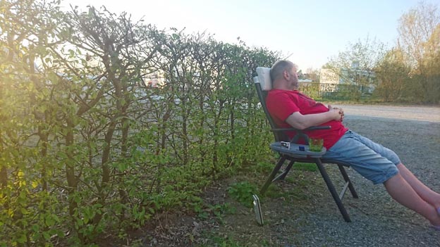Tillbaka på ställplatsen, mätta och belåtna. Det här var en härlig kväll. Vi hade 20 grader varmt, bladen var gröna, och vi kunde sitta och smälta maten och göra ingenting. Underbart!