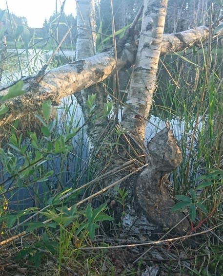 Här har bävern varit framme och gjort vackra träskulpturer. Den här gången låg det inga träd över vägen.
