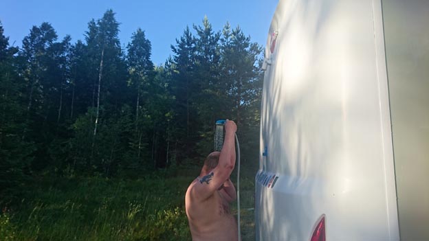 En nyinköpt campingdusch måste man givetvis testa. Den här var en av de bättre vi har provat, med batteridriven vattenpump och allt. Dessutom var batteriet uppladdningsbart. Funkade mycket bra.