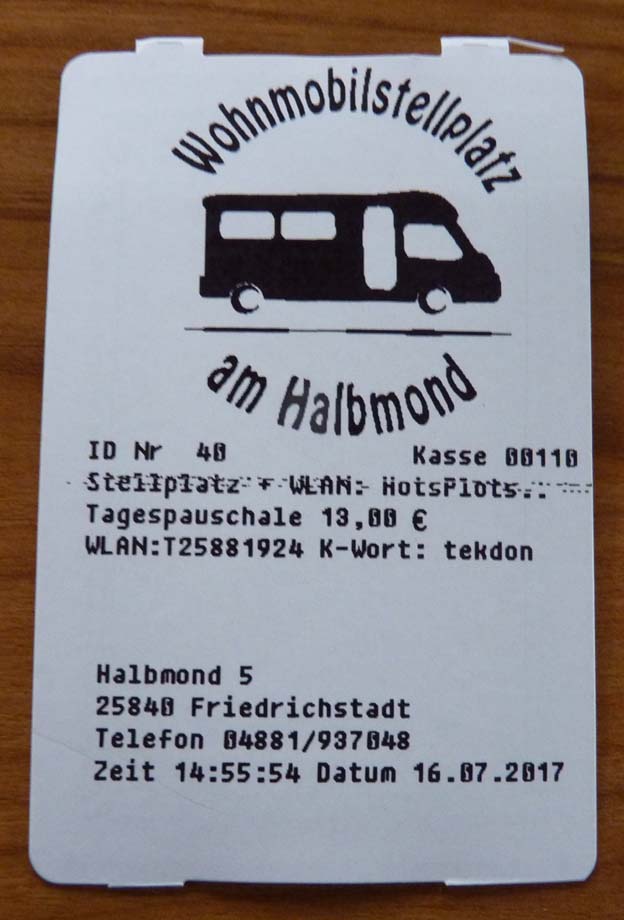 Jag hittade en ställplats i Bord Atlas, i Friedrichstadt. Här skötte man allt själv. Grönt ljus betyder lediga platser, rött ljus betyder fullt. Om det är grönt kör man fram till bommen och tar en biljett, som man måste spara. Biljetten används till allt på platsen, även för att kunna checka ut.