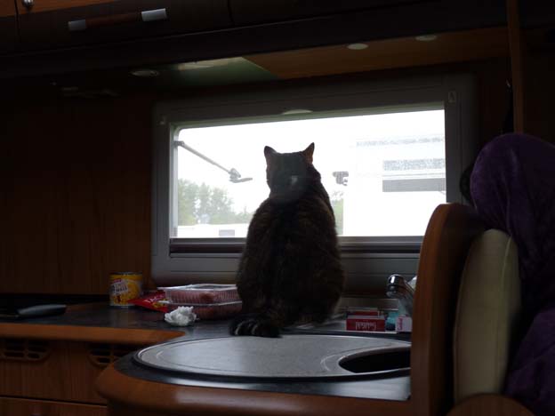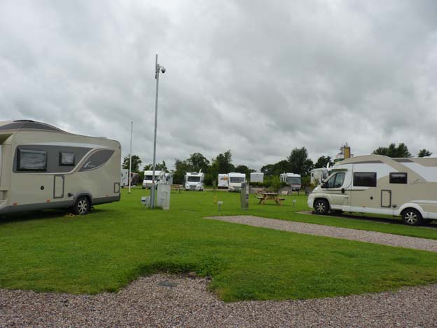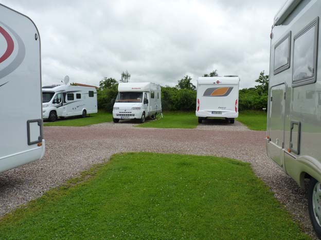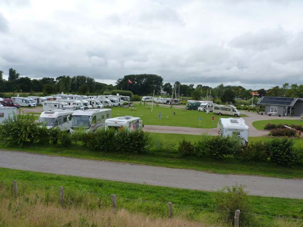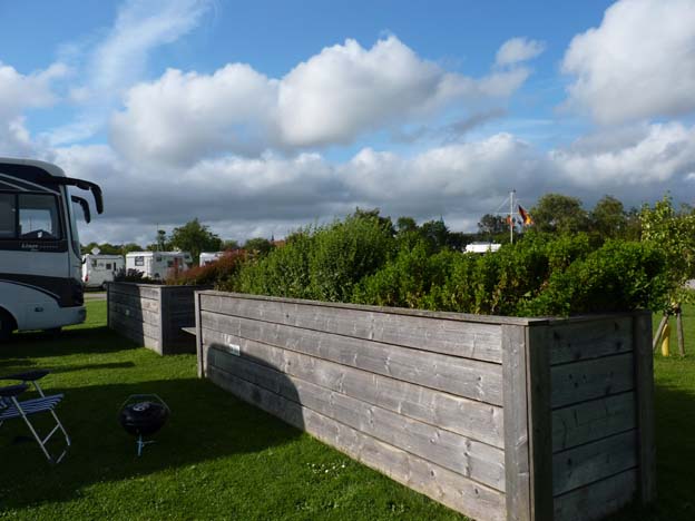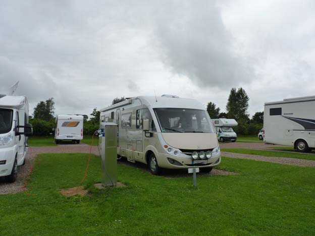Den här ställplatsen var mycket bra. Platserna var hyfsat långa, och det syntes precis hur det var tänkt att man skulle stå. Om man ville ha el laddade man sitt kvitto med pengar till det på något vis, berättade vår granne. Vi brydde oss inte om det, vi har ström så vi klarar oss ändå.