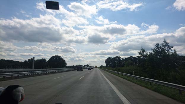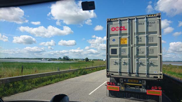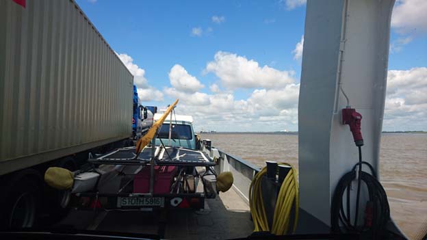 För att slippa kö på Autobahn under Elbe i Hamburg, tog vi färjan över Elbe mellan Glückstadt och Wischhafen. Där fick vi lite problem. Den närmaste vägen dit var avstängd, och det fanns ingen information om hur man skulle åka istället. Vi kom fram till en återvändsgränd vid avstängningen, och jag frågade en äldre man som vaktade avspärrningen hur vi skulle göra för att ta oss till färjan. Han var jättetrevlig, och lät oss åka genom avspärrningen och vägarbetet. Det var nämligen den enklaste vägen. Utan honom skulle vi ha haft väldiga problem med att hitta rätt.
