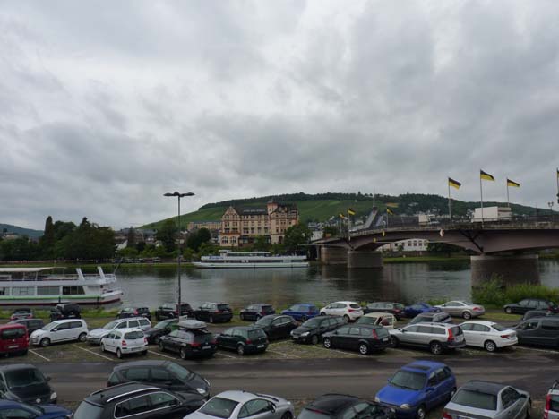 Idag tog vi en liten sovmorgon, och väntade på att vi skulle få lite bättre väder. Det regnade på natten, men redan tidigt på morgonen var det väldigt varmt. Luften var så fuktig så att vi blev alldeles klibbiga bara av att sitta stilla. När klockan började närma sig 12 orkade vi inte slappa mera, så vi tog cyklarna och gav oss iväg mot Bernkastel-Kues, ungefär två kilometer från campingen. Vädret började bli bättre, och det började komma fram lite blå hål mellan molnen.