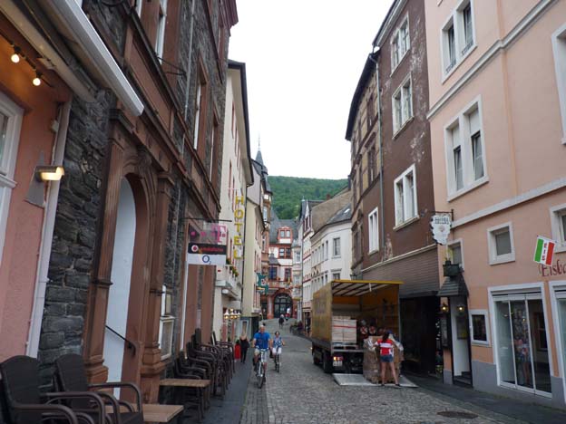 Det tog ungefär 15 minuter att cykla till Bernkastel från campingen. Hjulen på våra cyklar är väldigt små, så det gick inte fort. Vi var, trots långsamheten, alldeles dyngsura av svett och fuktig luft när vi kom fram, så vi satte oss och tittade på båtarna på Mosel medan vi väntade på att torka så pass mycket så att vi kunde visa oss bland folk.