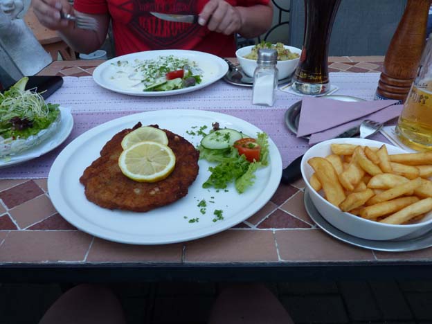 Vi åt på restaurangen som ligger bredvid den restaurangen där vi var igår. Lelle beställde matjes (som var ungefär som våran sill) och jag beställde en schnitzel igen, bara för att jämföra. Dagen schnitzel var mycket, mycket bättre än gårdagens, det går knappt inte att jämföra dem. Den här restaurangen heter Ufer Stübchen. Jag kan verkligen rekommendera den. 29.90 Euro för mat och varsin stor öl.