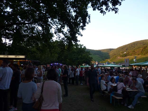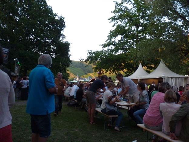 När vi hade ätit cyklade vi vidare till festplatsen i Kues, där det var vinfestival. Det fanns representanter från flera olika vingårdar där. Man köpte ett glas för 2 Euro, och sedan skulle man gå runt och få det påfyllt för ytterligare 2 Euro varje gång. När man ville ha ett nytt glas lämnade man in det gamla och fick tillbaka sina 2 Euro i pant. Smart system. Det fanns ett litet öltält åt mig också, som tur var. Jag dricker ju inte vin, så man kan ju undra vad jag hade att göra på en vinfestival i Moseldalen. Det gick bra ändå, det var väldigt korta köer i öltältet.