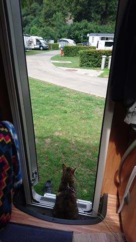 Olivia var först lite skeptisk. Det var mycket människor i rörelse eftersom vi stod så nära både servicehus och infarten till campingen.