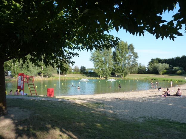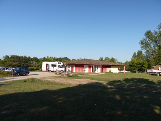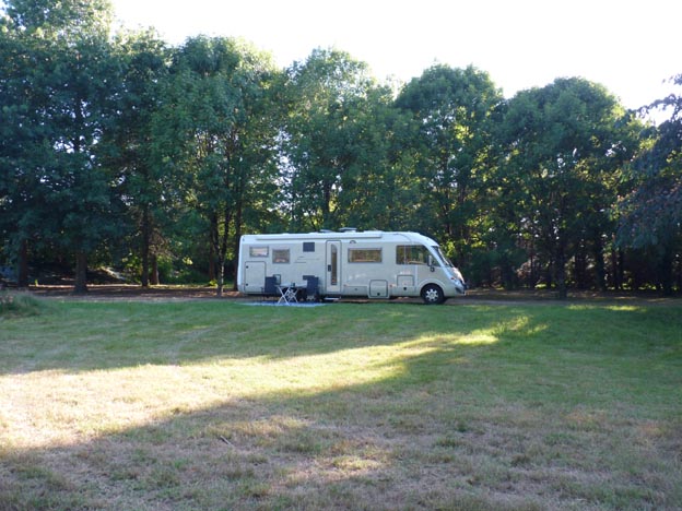 Det finns två områden att stå på. Området där vi står, består av en stor gräsmatta med omarkerade platser. Det finns gott om träd och skugga. Det finns även några elstolpar. Ström ingår i priset. Den här gräsmattan är en del av en kommunal park, så man får dela en bit av den med fransmän som spelar boule. Det kan även vara lite liv där från onyktra ungdomar på kvällen. På natten är det lugnt.
