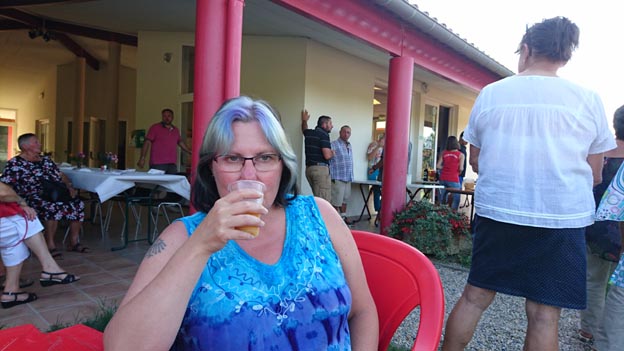 Huvudrätt: grillat fläsk med bönor och baguetter. Jag äter inte bönor, men fläsket var himla gott. Dessutom hällde de upp vin, så mycket man orkade dricka. Jag, som inte dricker vin, fick dricka öl i smyg i köket. De ville nämligen inte bjuda på öl hur som helst, eftersom det var dyrare än vin. Jag misstänker att de undrade vad jag var för konstig filur, som inte drack vin. Till och med barnen drack vin till maten.