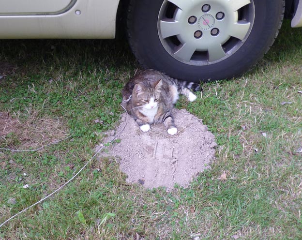 Underlaget på campingen är gräs, men är man katt går det bra att välja en jordhög att ligga i också.