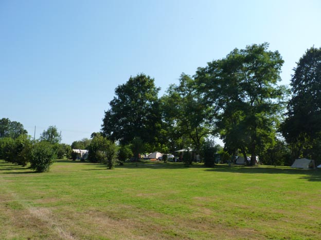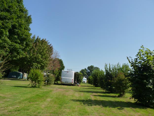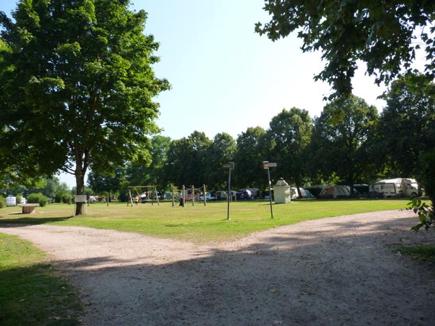 På campingen går en väg runt en väldigt stor gräsplan. Man står vid sidan om vägen om man vill ha skugga, för där är det stora träd. Mitt på gräsplanen är det ett stort lekområde på halva planen, och platser utan skugga på andra halvan.