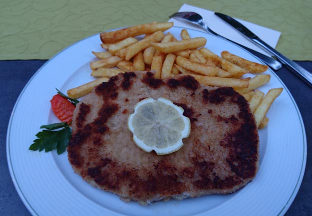 Vi var trötta och hungriga, så vi gick iväg en väldigt kort stund till en annan av hotellets byggnader, där det fanns restaurang och en Biergarten. Det var bra mat och service, men vi kunde inte riktigt njuta av den. Vi kastade i oss maten och drack varsin öl till, sedan gick vi snabbt tillbaka för att hålla Olivia sällskap.