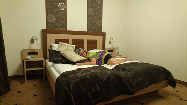 Hotellet var uppdelat i flera byggnader. Receptionen fanns i den byggnad som vi skulle bo i. Där nere var det nyrenoverat och väldigt fint. De hade hunnit renovera halva den byggnaden, och där såg det väldigt fint ut. I den halvan som vi skulle bo i var det slitet, färgen hade lossnat lite här och var i korridoren, och den bruna mattan hade mörkare bruna fläckar. Rummet var slitet men rent, förutom fläckarna på mattan som inte gick bort. Det dög att sova i, och det fanns ingen plast för vårt fönster åtminstone. Däremot var det en mycket trafikerad väg utanför som man stördes av om man ville öppna för att få in luft.