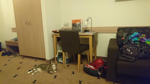 Någon gång mellan kl 18.00 och 19.00 ringde Folksam. De frågade om det gjorde något om vi bodde i ett hotell som höll på att renoveras och just nu var lite av en byggarbetsplats med plast för fönstren. Vi skulle få bo i ett av de orenoverade rummen som inte hade så bra standard, det var det enda de hade att erbjuda för en katt. Dessutom låg hotellet utanför ringmuren. Vi accepterade självklart erbjudandet, vi skulle få tak över huvudet, och om det var på en byggarbetsplats spelade inte så stor roll för oss i nuläget.