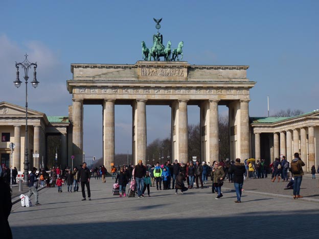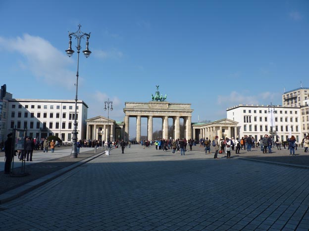Porten är den enda återstående av 14 stadsportar i Berlins tullmur. Den byggdes 1788-91, och står vid Pariser Platz, som avslutar Unter den Linden. Vanligt folk fick bara använda de yttre genomfarterna.