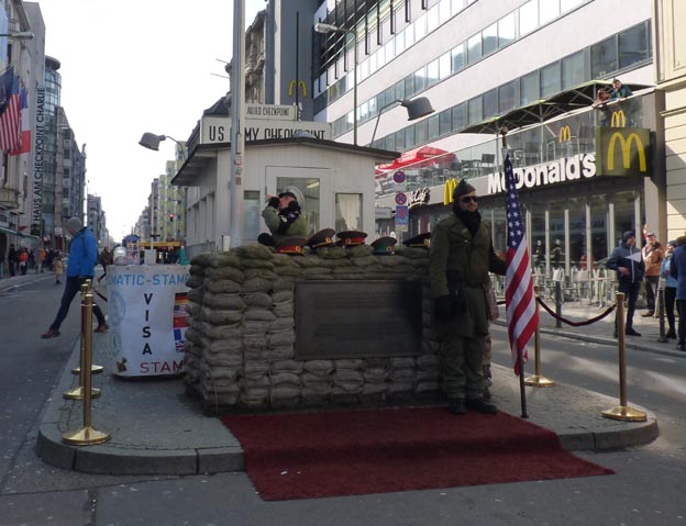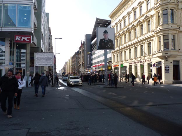 Checkpoint Charlie ligger mitt i en vägkorsning. På vänster sida finns KFC (Kentucky Fried Chicken) och på höger sida McDonalds.