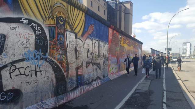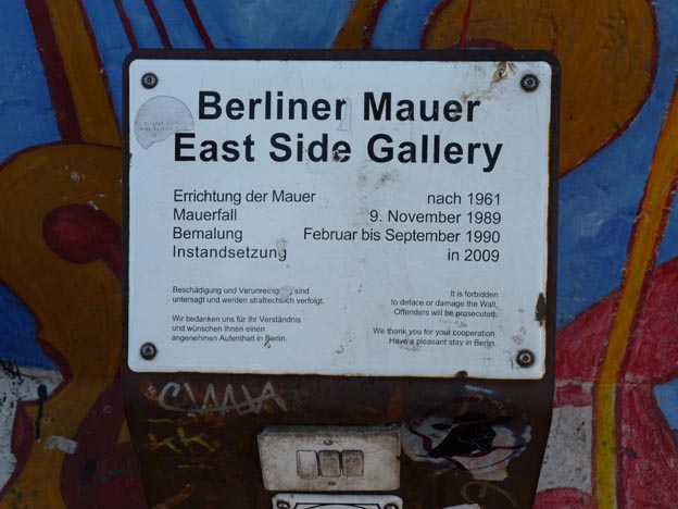 Efter att ha åkt tunnelbana igen kom vi fram till den del av Berlinmuren som det har målats graffiti på. Den här delen kallas för East Side Gallery. På murens östra sida finns 160 målningar av olika konstnärer från hela världen. Målningarna gjordes i början av 1990-talet, och galleriet invigdes i september 1990.
