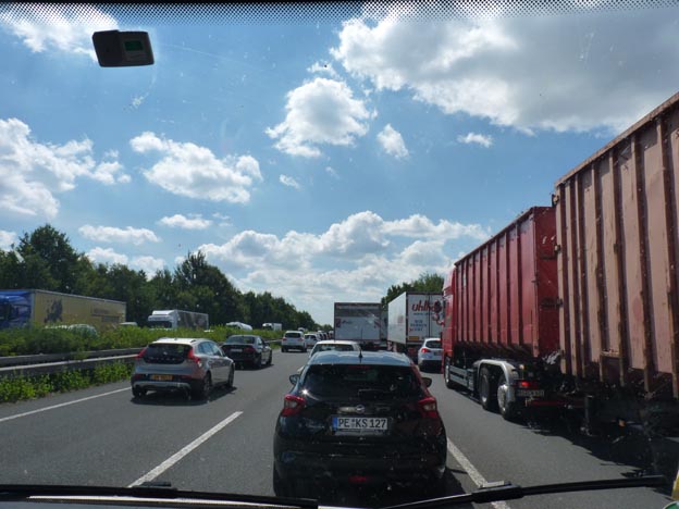 Mellan Soltau och Hannover var det mycket köer på A7. När vi hade stått i en dryg timme hade vi hunnit halvvägs, enligt google maps. Då gav vi upp. Vi körde av A7 vid Celle, det blev en omväg på 8 mil ungefär, men jag tror att det gick fortare än om vi hade stått kvar i kön. Dessutom är småvägarna trevligare, en motorväg är ju bara en motorväg.