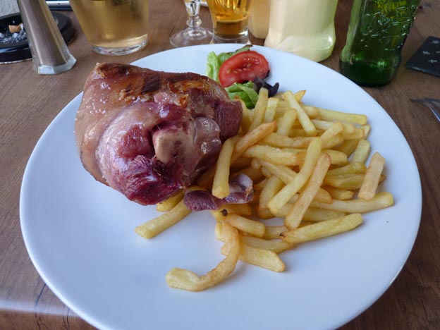 Jag åt fläsklägg, och Lelle åt fisk. Maten smakade bra, men det var lite underligt att äta pommes till. Både till kokt fisk och fläsklägg. Vi är ju vana med rotmos som tillbehör till fläsklägg. Ja ja, huvudsaken att smaken var bra. Servitrisen var en äldre dam som bara pratade franska. Hon var inte särskilt trevlig. Benjamin sprang runt och lättade upp stämningen med sitt skratt på restaurangen, när han inte sprang till receptionen eller kiosken eller sin loppis.