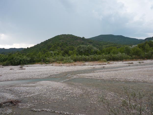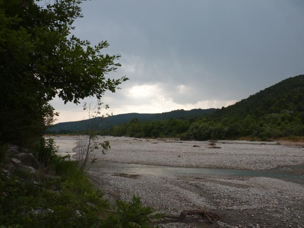 Precis utanför campingen finns en bred flodfåra. Förra året var den helt uttorkad, men i år fanns det faktiskt lite vatten i den.