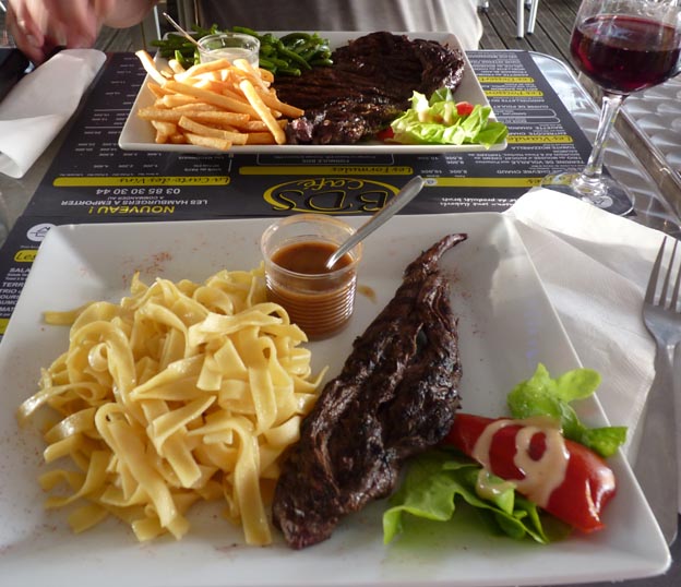 Menyn fanns bara på franska. De som jobbade pratade bara franska. Google translate funkade hjälpligt, så vi kunde åtminstone gissa vad vi skulle få att äta. Lelle åt entrecote, och det vet vi ju vad det är. Jag beställde Bavette Charolaise. Det var kött som påminde lite om en trasig skosula i utseendet, men det var gott. Väldigt bra tillagat. Tjejerna som serverade var väldigt trevliga, och det gick att kommunicera lite med google translate, men det känns ändå jobbigt att inte kunna språket.