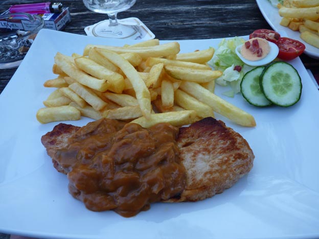 Jag beställde schnitzel med campinjonsås, och fick en opanerad fläskkotlett med en sås där det fanns några burkchampinjoner och en himla massa ketchup. Såsen smakade bara ketchup, och var alldeles kletig i konsistensen.
