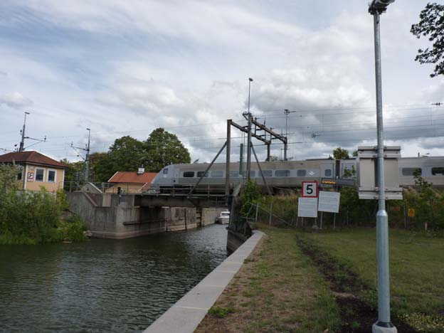 Det blir broöppning med jämna mellanrum, som man kan titta på. Det går tåg över kanalen väldigt ofta, och då får båtarna vänta.