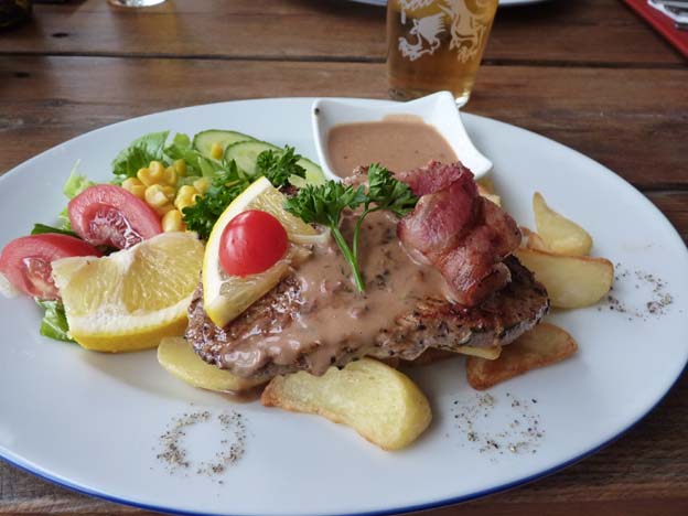 Och, till sist, anledningen till varför vi åkte tillbaka hit: maten. Maten lagas på vandrarhemmet, och den har varit väldigt bra vid båda våra besök. Det är bra service, lagom mycket mat, och bra tillagat. På bilden ser vi deras extremt goda pepparstek med klyftpotatis.
