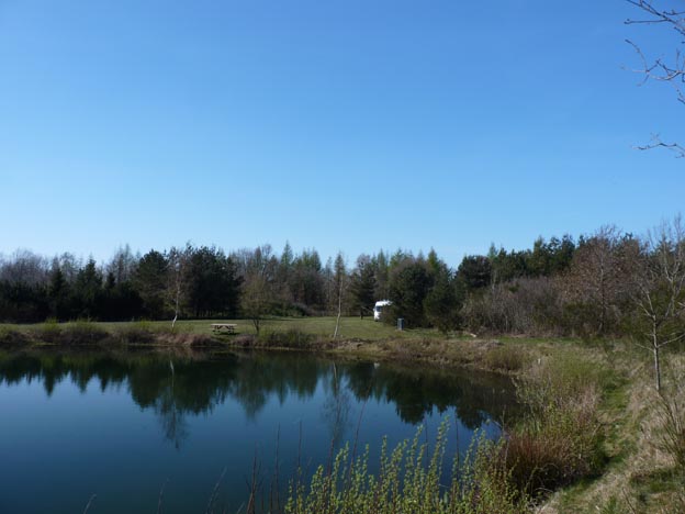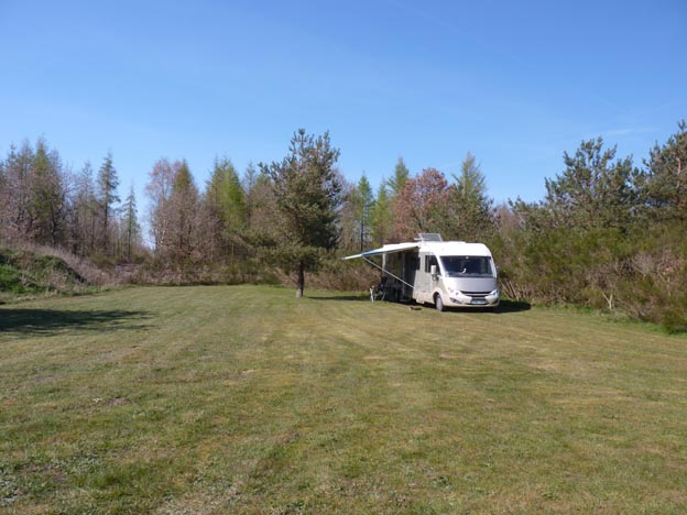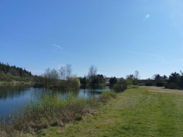 Vid Renbæk fiskesø stod vi fint på en stor gräsmatta med utsikt över sjön. Underlaget var hårt trots att det var tidigt på året.